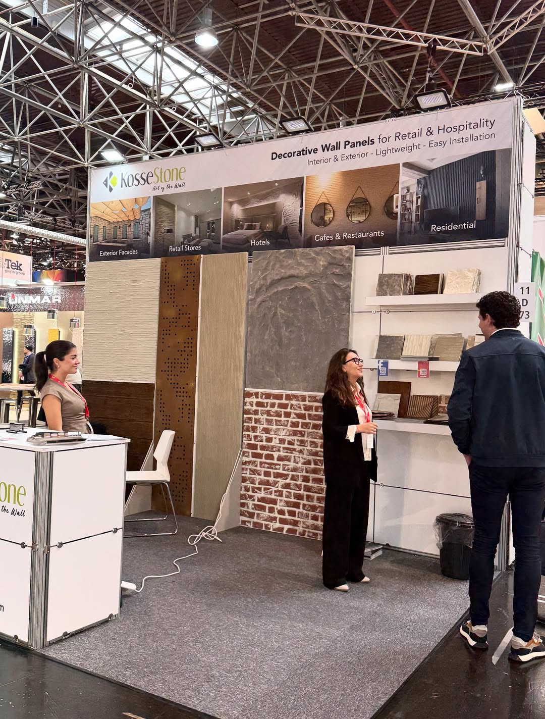 An unserem Stand präsentierten wir den Fachbesuchern eine exklusive Auswahl aus unserer umfangreichen Bibliothek. Unsere über 65 Paneelmodelle, inspiriert von Stein-, Ziegel-, Holz- und modernen Texturen, stießen auf großes Interesse. Besonders die Farb- und Texturoptionen, die wir speziell für die dynamischen Anforderungen des Einzelhandels entwickelt haben, zeigten einmal mehr, wie wir die Grenzen im kommerziellen Raumdesign verschieben.